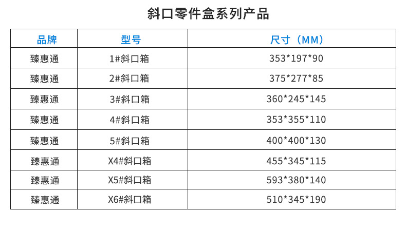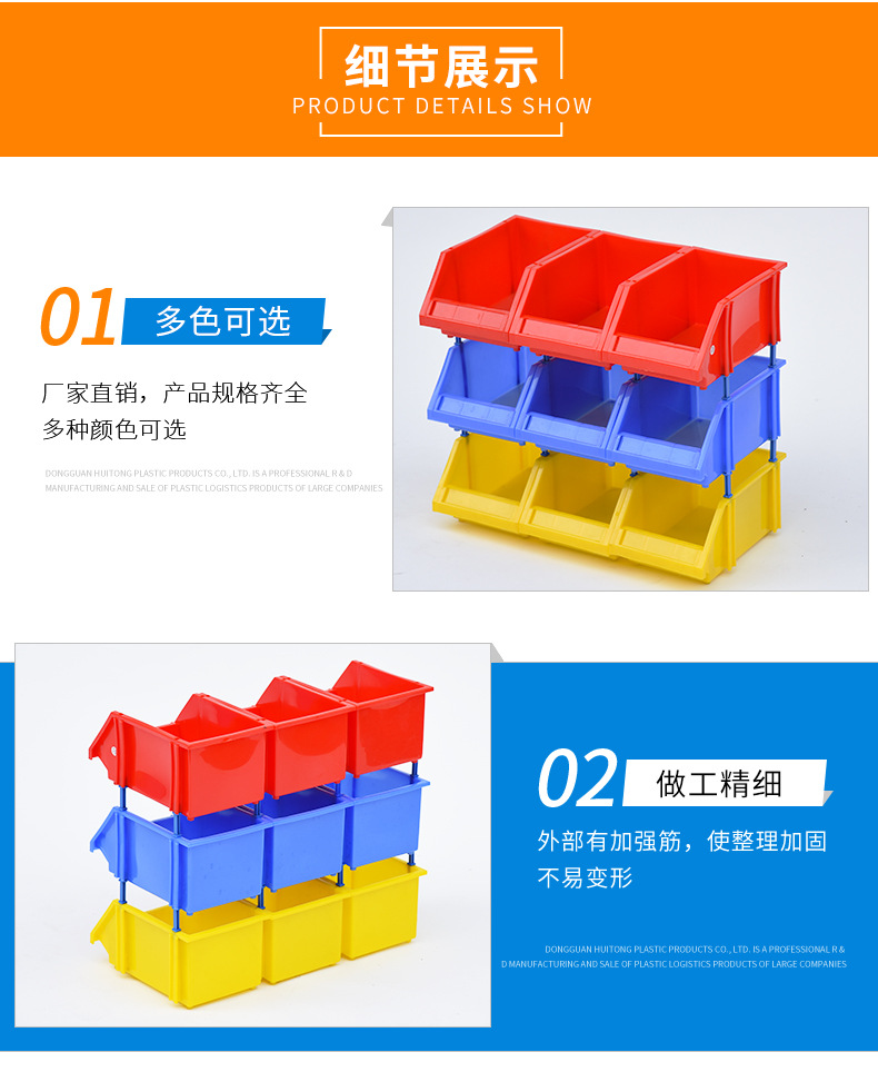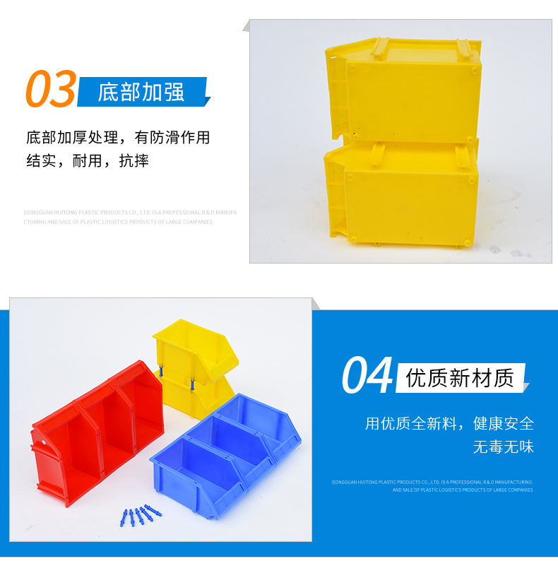 斜口零件盒:由於斜口設計,使得零件的存取更加方便快(kuài)捷,特別是在(zài)需要頻繁取放零件的場景中,如裝配線、維修車間等,能夠顯著提高工作效率。因其特殊(shū)的設計和高品質材料,更適合需(xū)要頻繁取放零件的場景,如機械製造、汽車(chē)工(gōng)業、電(diàn)子工業等行業(yè)的生產線和維修車間。