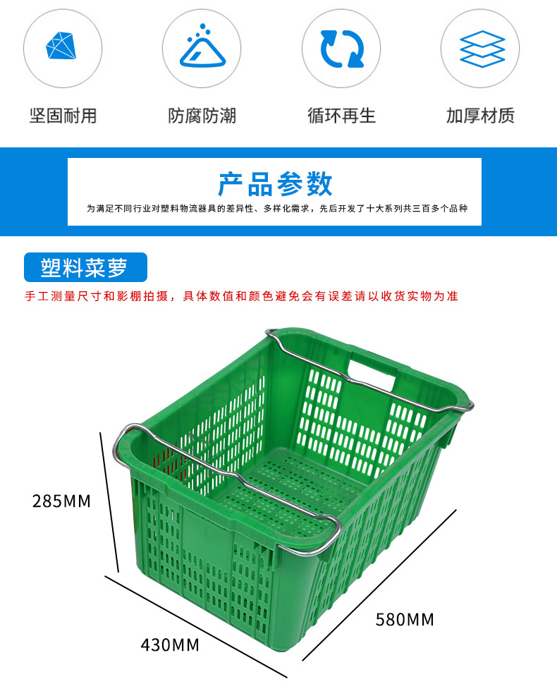 工藝優勢 :注塑一體成型,壁厚2-6mm,耐用(yòng)性遠(yuǎn)超普通塑料筐。