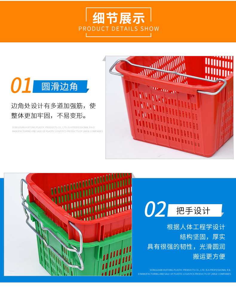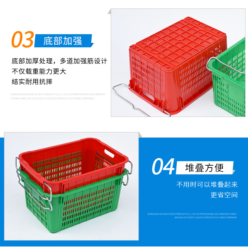 鐵耳蔬果塑料筐采用(yòng)全新(xīn)PE/PP塑(sù)料(100%新料),具有抗摔、耐磨(mó)損(sǔn)、韌性強等特點,確保長期重(chóng)複使用。